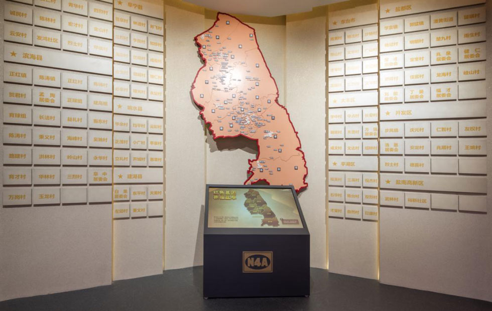 鹽城新四軍紀念館是全國唯一的專業性新四軍紀念館。醒目的藍白相間的“N4A”臂章圖案,鑲嵌在展廳正門上方,兩側旗形的花崗石陰雕畫,藝術地再現了新四軍與八路軍在白駒獅子口勝利會師和皖南事變后新四軍在鹽城重建軍部的歷史場面。